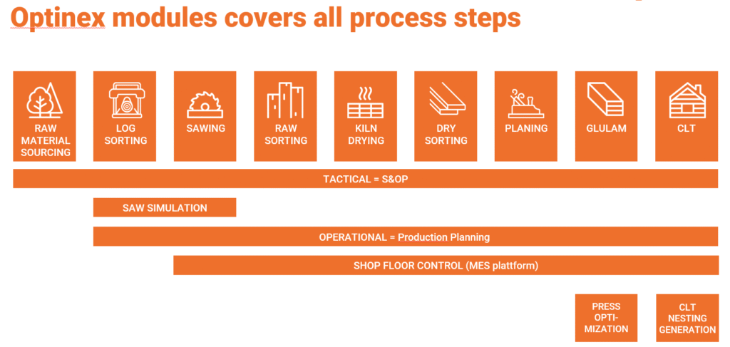 Optinex är ett planerings- och optimeringsverktyg för hela värdekedjan inom sågverks- och träindustrin. Optinex adderar branschspecifik planering för SAP S/4HANA-kunder. Verktyget opererar på taktisk, operativ och strategisk nivå och täcker alla tidshorisonter samt varje steg i processen. Lösningen ger kunderna en digital tvilling av deras verksamhet. Lösningen stödjer beslutsfattande över hela värdekedjan och inkluderar även moduler för korslimmat trä och limträ.